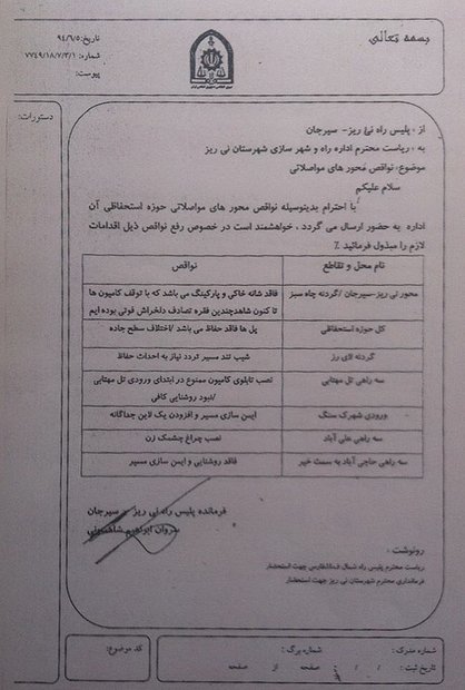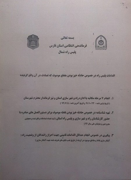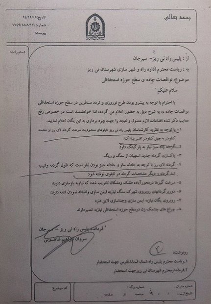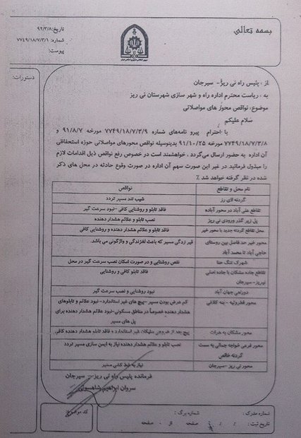 به گزارش مجله خبری سیرجان ،بر اساس این مستندات پلیس راهور ناجا ۷ مرحله مکاتبه با اداره راه و شهرسازی شیراز و فرماندار شهرستان مربوطه در خصوصی ناایمنی این محور از ۲۴ دی ۹۱ تا ۵ شهریور ۹۴ انجام شده است.