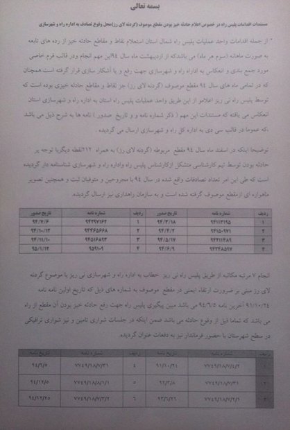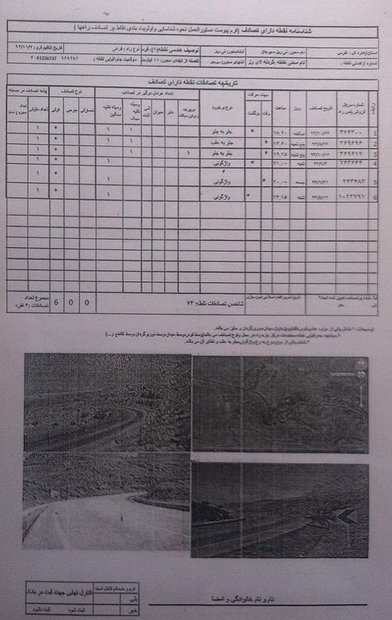 از سوی دیگر در سال ۹۴ شناسنامه حادثهخیز بودن نقطه موصوف برابر دستورالعملهای صادره با حضور کارشناسان راه و شهرسازی و پلیسراه استان تهیه شده و پیگیریهای لازم نیز در خصوص انجام حداقل امکانات تامینی جهت احراز رانندگان از وضعیت راه شامل آشکارسازی نقاط و مقاطع موجود در گردنه این محور از طریق نصب تابلوهای تعریف شده جهت آشکارسازی